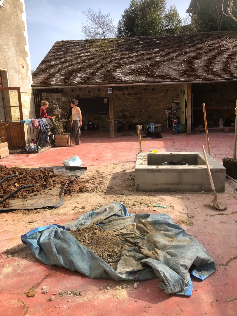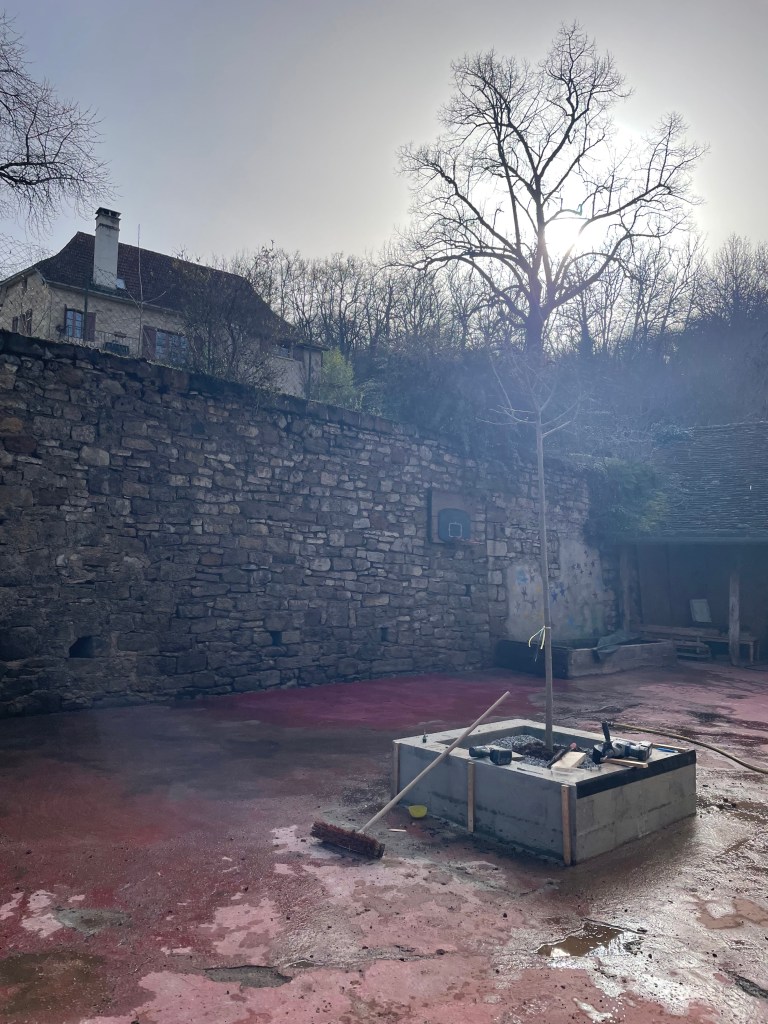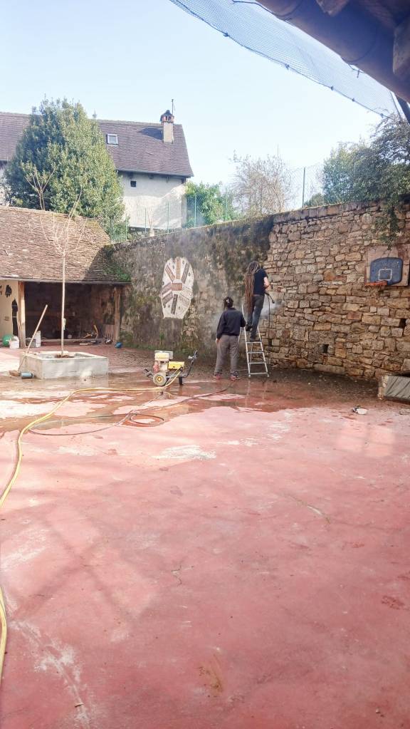 Élodie, Yoann, Bernard, John, Daniel et Marie-Lien ont participé à différents petits chantiers : la plantation d’un mûrier platane au cœur de la cour, le nettoyage au karcher du sol et du grand mur en pierre du fond de la cour, ainsi qu’un petit nettoyage pour préparer l’arrivée du printemps.
